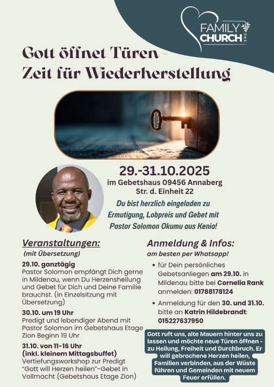 Morgen: Workshop der Family Church mit Pastor Solomon aus Kenia